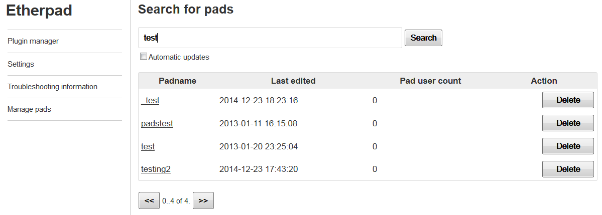 Etherpad plugin to list and delete pads in /admin.