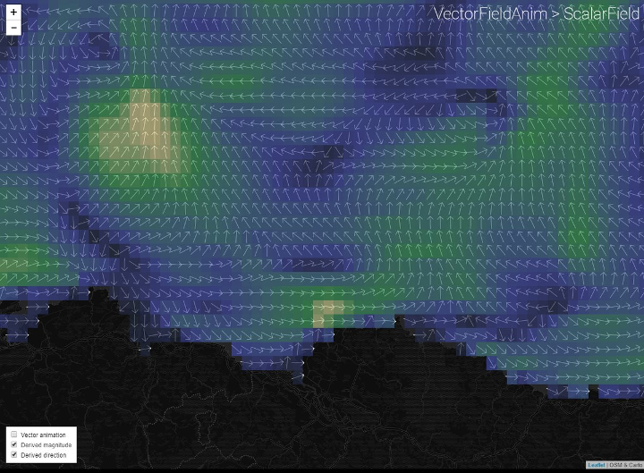 A set of layers using canvas to draw ASCIIGrid or GeoTIFF files. This includes a basic raster layer (*ScalaField*) and an animated layer for vector fields, such as wind or currents (*VectorFieldAnim*)
